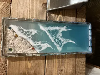 トレーにすべきか表札にすべきか... またまた懲りずに海レジンを作っています。 100均で購入した透明のトレーの中に海を作ってみました。 一気にやってしまうと失敗しそうだと思い、何層かに分けてレジンを流し込むことにしました。 ちなみにトレーの周りにはガラスタイルを貼りました。こうすれば横からレジンの層の変わ
