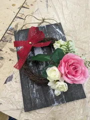 シルクフラワーを使ったリースボード 今日は浜松雄踏店でワークショップでした。ちびのミイさんと一緒にやってきました。花がもりもりな感じになってしまった感が強いですが、結構早く仕上がりました。ちょっと物足りなさを感じたので、ピンを買ってきてリボンにつけてみましたけど。 来月の方にも予約を入れているので、どうなるか楽しみです。クリ