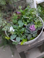 秋の寄せ植え 昨日、お庭を整理したので…空いた鉢に早速、寄せ植えを。フリルのビオラ2種に葉牡丹、あとは自宅で増殖中のグレコマ、ツル日々草、アイビー、あともう一つ(名前が出てこない💧)。もう2鉢ほど寄せ植えたらボリュームが出たのかも。