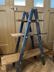 ボルトにヤスリをかけてアイアンペイントをスポンジでポンポンします😉蝶番もサビサビ、ネジ部分にポンポンするとアンティーク感がグッと出ます😎先日カインズ西神南店で作ったステップラダーをアレンジ🤓脚をシャビーに塗ったのでもっと男前にしました!チェーンを安定のために付けてサビサビ、ボルトや脚もサビサビにして