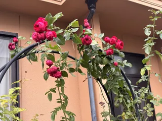 ルージュドピエールドロンサール 夏の暑さでも負けずに枝がグングン伸びて💦少し多めに剪定しました。こんな感じを優しく這わせて今年は綺麗に咲きました💞