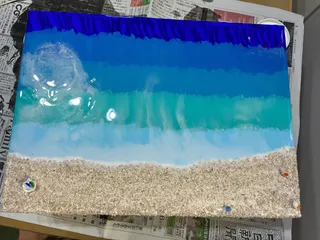 今日は朝から頑張ってレジン。 100均で購入したキャンバスに砂を貼ってから、絵の具で塗り塗り。ここでまず失敗😔wどうしても厚塗りになってしまうのです... 絵の具が乾いてからレジンを流し込む。またここで失敗😔w 波🌊もやはり普通の絵の具なので、シュワシュワした波にならず