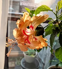 2段咲きハイビスカス🌺、3段にも見えるのですが? 今日の2段咲きハイビスカスは、段の数が添付札より多いように見えます。オレンジハイビスカスの蕾落下でしょげた私を慰めて頑張ってくれたのかな?息子の指摘で気になって、アップ写真を撮ってみました。3段に見えますか? 😊