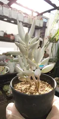 銀月 銀月という多肉です一年中白い多肉です白いキツネのしっぽみたいで気に入っています☺️ 多肉を始めた頃すぐに枯らしてしまってリベンジし、何が良かったのかわかりませんがいつの間にか育ってくれています 斜めになっていたので土を入れて真っ直ぐにしました