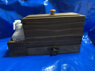 完成 開け過ぎ防止の金具と鏡を付けてみました。玄関に置いて使えるようにサイドには消毒液入れも付けました あげる予定より思いもよらず時間が掛かって遅れたけど渡せたからよかったです。