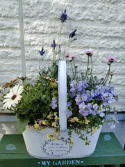 手付きブリキの春の寄せ植えを作ってきました😊オステオスペルマムネメシアとローダンセマム奥がレースラベンダーと手前フォックスリータイムタイムの新芽がイエローなんですって😆 かわいい💕我が家の玄関がにぎやかになってきました〜🥰