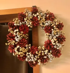 想いを込めて誰かに贈るもの 昨年のクリスマス前に友人にプレゼントしたクリスマスリースです。グリッタースプレーで赤くした松ぼっくりとナンキンハゼの実で作りました。昨年はナンキンハゼの実が豊作でふんだんに使えてラッキーでした。下はいつも木屑まみれになっている私に娘が作ってくれたクレープです。贈られたものなのでオマケでこちらに載せさ