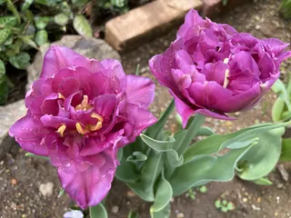 紫の八重咲チューリップ❗️ 15センチくらいなのに、豪華な、八重咲チューリップが咲きました!我が家にて、初めての春です☘️