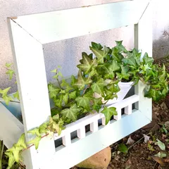 スタンド型フラワーフレーム DIYのワークショップに通い始めた頃に作ったスタンド型フラワーフレームです。一年以上飾っているので、四隅の塗装が剥がれ始め、そろそろ塗り直そうかと思っています😊写真では白っぽいのですが、実際は枠がミントグリーンで、柵がパールホワイト✨爽やかな明るさで気に入っています。今、塗り直しの色も同じ色にしよう