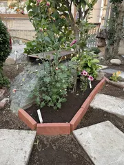小菊花壇の囲いを赤レンガ半ペンに変更 ↑after↓before火成岩で囲まれてた花壇を赤レンガ半ペンに変更して整えました。火成岩を土中に隠す(リンク→ https://diy-square.cainz.com/announcements/cj2wt0rxpwnnozje )為に整えてます。↓ 火成岩を外してる様子です。