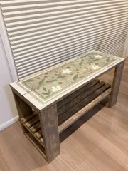 シェルフベンチ 先週、常滑店にてDIYをして来ました。初、ステンシルでした。ベンチを作ってからのステンシルなので、DIYを2講座受けている感じでした。大変でしたが、出来上がりに満足です。ありがとうございました。高さが40cmなので、玄関の靴を脱ぎ履きする時に便利な高さです。今まで幾つもベンチを作って、玄関のベンチ迷