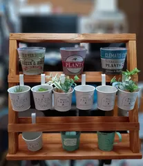 スリッパラックの利用方 多肉並べました。スリッパラックの投稿見て100均で買ったブリキ缶で飾って見ました。最初作った時の利用方です。夫婦参加で2つあります。