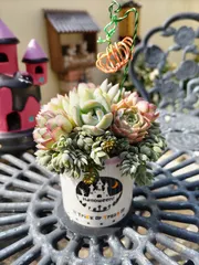フラワーマーケット行ってきました✨ 日にちと場所を間違えてお騒がせした😅フラワーマーケット行ってきました。10時開催なのになんと50分前に着いちゃって車の中で待機、多肉のモリモリ寄せ初の体験でしたがTagさんのご指導で可愛くできました💞ありがとうございま〜す。みかんさんに頂いた🎃かぼちゃのピック挿したらますます可愛くなりましたよ、あり