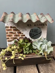 おうち型多肉プランター 約1週間前になりますが、やっと念願の多肉プランター作れました😊小さいのですが意外と時間がかかり、久しぶりの大変な😅波板もなんとかつけました。乾燥中です♪汚しをつけて作業は完成。自宅に帰ってからレンガ模様とモルタル風にしてステンシルを加えて多肉を植えて完了しました。多肉コーナーにまたまた可愛いものが増