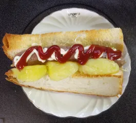 手作りごぱんとウインナーでホットドッグ🌭 ごぱんは1/4にカットしたものを斜めに切り込みを入れてトーストキャベツは千切りにして薄めにドレッシングをかけて合えるウインナーはフライパンで温める昨日ポテトサラダ作ったときによけておいたじゃがいもの茹でてあるものを軽く焼くマヨネーズ、ケチャップでお化粧して出来上がり😋 食べた後で、「タマネ