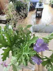 5年越しの🌱スモークツリーが咲きました スモークツリーが今年初めて咲きました(涙)アイビーゼラニウムとカンパニュラもカットして花瓶に♪スモークツリーは水が下がりやすいのでトンカチでトントンしたら、1週間経っても元気です。