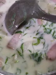先日、手作りウインナー教室で作ったウインナー、今日のメニューは大根のクリームシチューに入れました。コンソメで煮た大根が柔らかくなってからウインナーは半分に切って入れました。あとはいつものホワイトソースを作り、混ぜて出来上がり大根葉を散らして完成です。