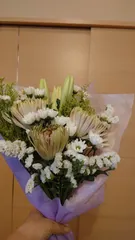 お供えの花束 ご近所の100歳のおばあちゃんが、亡くなりはったとのことで 、少しですが仕事場で購入してきたお花を、心を込めて花束にしてお供えさせていただきました。最後まで自宅でご家族に看取られて幸せな大往生の人生だったようです。