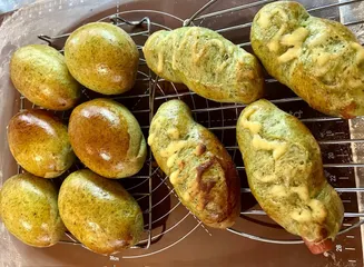 ホームベーカリー㊷ヨモギあんぱん ヨモギもちを作るために春に摘んでゆがき冷凍保存してたヨモギを使ってパン生地を作り、つぶあんを包んで焼きました。強力粉290gに刻んだよもぎ50g。実を言うとこのよもぎ、冷凍庫で2年くらい保存してたもの😅。霜だらけ💦 心配したんですけど、いわゆる冷凍庫臭は全く残りませんでしたε-(´∀`;)