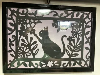「大人の切り絵🐈⬛」 友達が100均で見付けたのでアタシも買ってやってみた✂️ デザインカッターでちまちま…… これは何とか上手く出来たかな♬.*゚やはり細かいとこは曲線が直線に🤣 _| ̄|○ il||liダメダメだ💦2枚目のお花のは全くダメ┓(*´゚ω`