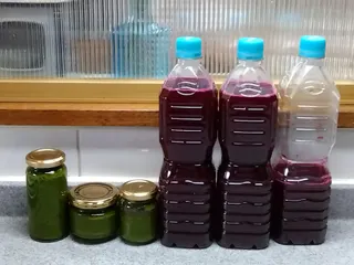 赤紫蘇ジュースとバジルソース サファイアさんの家で赤紫蘇の葉だけで2kgで赤紫蘇ジュースを濃いめに作りました😊🎶バジルソースも作りましたした😉💕🎵とても美味しいと喜んで頂きました😊🩷