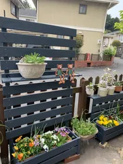WSで作ったフェンス付木製プランターカバー右側は規格サイズ左側はフェンスの部分を60㎝から150㎝に変更しましたそして、中央位に棚を付けました100均で買った黒いパーツを取り付け棚をスライドして取り外すことが出来ます🤞外せばサイドに吊り鉢が飾れます。