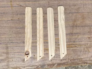 園芸用ラベル 100均で買って使ってたプラスティック製のが切れたので、取り急ぎ、端材で作成。2㍉厚位、幅18㍉位、長さ150㍉位で、サンダー掛けして、下穴錐3㍉用で穴開け、です。