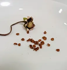 ガーデンシクラメンの種を採取しました。 ガーデンシクラメンの実、漸く採取の時期の様です。小皿の上で軽く押してピンセットで種子を取り出しました。発芽適温が20℃位なので、乾燥させて紙封筒保管(冷蔵庫)しようと思っています。秋蒔、春蒔イケるそうです。野菜室保管はOUT、親株と同じ花が咲くとは限らないらしいです。楽しみです。ただ、鉢数が増える予