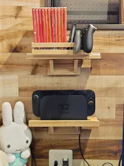 Switch用のゲーム棚 ■作品内容Switch2が我が家に来たので置き場所に困り、ゲーム機専用棚を作ろう!とカインズのインテリアウッドで作りました。 ■こだわりポイント壁紙のウッド調にも合っていて、後ろからケーブルを通せるようにしたので見た目もスッキリ。今はソフトが並んでますが、SwitchとSwitch2と2台