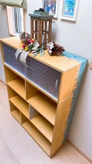 収納棚2種 WS作品の【引き戸付収納棚】と【キッチン収納棚】です✨自宅にてアレンジさせて頂きました🏠🎨上段の引き戸窓には100均シートを貼って取っ手はレジンで作って両面テープでペタリ下段の真ん中の仕切りは外せたのでこれも柄入れ🎨絶対自分1人じゃ作れない大物家具✨今年も1年アドバイザーさんのおかげでDIYを楽しま