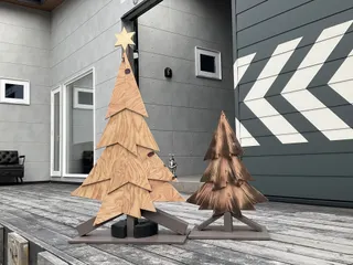 ■作品内容  カフェの庭にオシャレなツリーでクリスマス気分を盛り上げる〜■工夫ポイント 先日は左側のツリーをご紹介させて貰いましたが・・・まだまだ端材があるのでジュニア版をまたもや作りました💨今回は、以前作ったウッドフェンスで使用した野地板の端材で作りましたよ🪵💕木目がイマイチだったので、トーチで焼