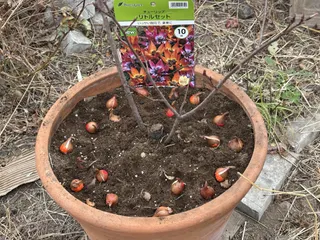 ダブルヘッダー♪ ジェーンベリーの鉢植え、周りに背丈の小さなチューリップ球根を仕込みました♪冬の水やり忘れ防止にもなるかな。 春になって賑やかにさいてくれますように。