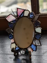 ステンドグラスミラー✨ 長崎歴史文化博物館で体験したことはありましたが…ほぼ初めてのステンドグラスWS😆遠征も全然苦になりません🎵ミラーの周りのガラスを決めて銅のテープを巻き…ハンダで接着したらこんな姿に✨その後、薬品で銀色の部分をなぞると、アンティークな色味に変化します🎵ハマりそうな予感😆