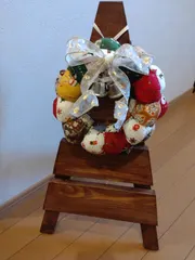 可愛いクリスマス柄の生地がふんだんに使われていて、素敵なリースですね❣️ リーススタンドのお色にも、お似合いですね🎶