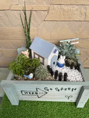 多肉ミニチュアガーデン 初めての川島インター店にて作ってきました🤗ストアオリジナルの多肉ミニチュアガーデン🪴作ってよかったです💖 おうち型の屋根はいつもアクアなんですが、アクア終了との事で、パリジャンブルーにしました😅この色も好きです🩵3つ選べる植物はこれにしました☺️家にあるサボテンを1個追加。前面には川島店で