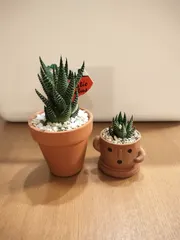多肉植物大小 CAINZホームで前に購入した埴輪のデザインの植木鉢に、ブラックフライデーの買い物でCAINZホームに行って、可愛い多肉植物を見つけて購入し3株のものだったので、分けて植えてみました。お気に入りです。