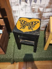 B&Bシェルフスツール ■作品内容B&Bシェルフツール■こだわりポイント天板はダメージ加工ガンガンたたいてアンティークになるように加工しました✨角はすべてたたいて丸くしました✨最後にブラックでハートに形作って可愛らしさを表現しました✨