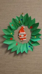 ■作品内容 *紙皿の真ん中をくりぬきを土台にします*緑の色画用紙で葉っぱの形に切り取ります*紙皿の土台に両面テープで葉っぱをつけていきます。折り紙でサンタクロースを折って真ん中に吊るします ■工夫ポイント 葉っぱは縦半分に折り目をつけさらにねじるように折り目をつけると葉脈のように筋