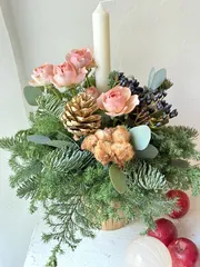 ■作品内容ヒムロスギやもみの木、ユーカリなどを使いキャンドルと合わせて飾れるクリスマス用のアレンジメントにしました。■工夫ポイント真ん中のキャンドルが高くなるよう周りの針葉樹は全体に低くなるようにしました。あと、ゴールドに色付けした松ぼっくりを入れたりピンク色のバラを入れ、優しい雰囲気のクリスマスツ