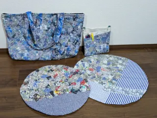 端切れキルトでバッグ👜やマット ■作品内容お洋服を作った残りの端切れリバティ生地などを接着キルト芯にミシンキルトし、それをバッグやマットに仕立てました✨ ■こだわりポイント2〜3センチくらいの小さい端切れを彩りよく並べるのが、意外と難しく💦自分好みの色味になるようにがんばって並べました🎵ミシンキルトは適当(ここが大事!)