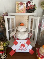 ■作品内容20年以上前に作ったうさぎのカタチの鏡餅うさぎ餅です🐰捨てられずに取っておいたのを思い出し、飾ってみました🤗長年しまいっぱなしだったので布の汚れがありますが、よく作ったと思います😆 ■工夫ポイント確か本を見ながら家にあった布で、手縫いで作りました。頭の上のみかん🍊がポイントです♪