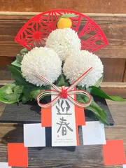 ■作品内容生花のポンポンマムを鏡餅の様に並べて御飾りをつけました■工夫ポイントお餅に見える様に配置しました