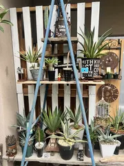 パレットをカインズのピュアホワイトでペイント。三脚には、アガベ、ユッカ、黒法師を配置してみました。