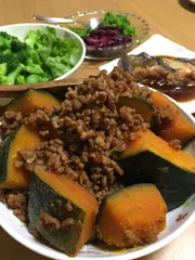 かぼちゃの煮物 ■作品内容簡単に秋を楽しむ料理です■こだわりポイントひき肉とかぼちゃを水、醤油、砂糖で煮ただけの料理ですが、簡単に旬のかぼちゃを味わえます!砂糖も少なめでも十分甘いので大満足でした!かぼちゃも大きく切ってフライパンで強火で一気に煮ていき10分程で出来上がり♪