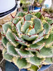 アガベ(吉祥冠錦)子株出てました💕 猛暑でも元気なアガベ子株が出てました💕秋になったら株分けしょうかな❓🥰春にお値引きセールで買った子徒長してた頭をカットしたら子株がワサワサ出てきていっぱい増えそう❗今年のお正月にお迎えしたアフターグロウなかなか葉数が増えないなぁと思っていたらまさかのど真ん中から花が………💦ちょっと先行きが心配😑