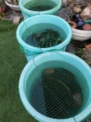 メダカ水槽の鳥避け、害獣避け 水槽に金網を掛けようと思いましたが、昔使っていたサクランボの鳥よけネット(100均のものですが)一枚で3つの水槽に覆いをすることが出来ました。 隣の水槽にネットを掛けるときに2回ひねって水槽同士が重なるところにはめ込んで押さえることでハズレにくくなりました。餌やりも網の隙間から出来ます。&