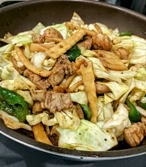 茹で筍入りの回鍋肉、ヨモギの天麩羅添えました。😋 月曜日の10%引きデーが雨で、食材ガタガタです。用事片付けで、今日も外出無し。冷蔵庫の半端野菜掻き出して、回鍋肉になりました。筍合いそうと一緒に炒めました。ラス2のピーマン終了。奥に隠れてたキャベツ、白ネギ発掘。 息子土産のヨモギを天麩羅にしたら天ぷら粉が余ったので、舞茸もちぎって揚げてみ