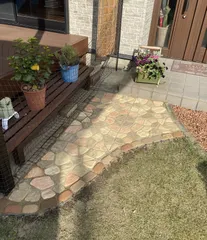 ガーデンブロック敷設しました 玄関前にガーデンブロックを敷設しました⛏ガーデンブロック敷くのは今回で3回目なので慣れたものです。が、芝生を剥がすのがめちゃくちゃ大変!ミミズも沢山出てくるし😭主人と2人がかりで、なんとか剥がせました💦写真は芝生を剥がした後の状態です。この後レンガで縁取りをし、平らに慣らしてガーデンブロックを敷いて