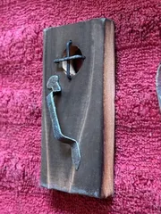 妖精さんお招き計画2回目、今日はドアと小窓を作ります。ドア自体は以前作ったものがあるのでそれを使うとして、ドアノブどうしようかな?100均のカシメにするか…釘を叩いて作ってみようか…。釘をラジオペンチで挟み、使わなくなった鉄アレイを金床代わりにしてハンマーでトントンして平たくしてから…それっぽく曲げ