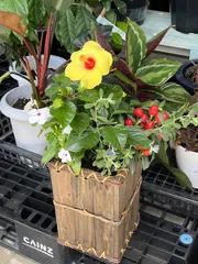 ハイビスカス🌺の寄せ植え! 昨日は、羽生店にて、グリーンWSに参加して来ました🥰初めて参加の方が2名で、計4名🤗今回、日日草や観賞用トウガラシ等の4種類の寄せ植えです🤗ハイビスカスは、赤、黄色、ピンクから選び、日日草も、かなりの色があり、自由に選ぶ事ができました🥰💕今回、鉢もステキでした🤗さっき、5時半位に、犬の散歩に外に出た